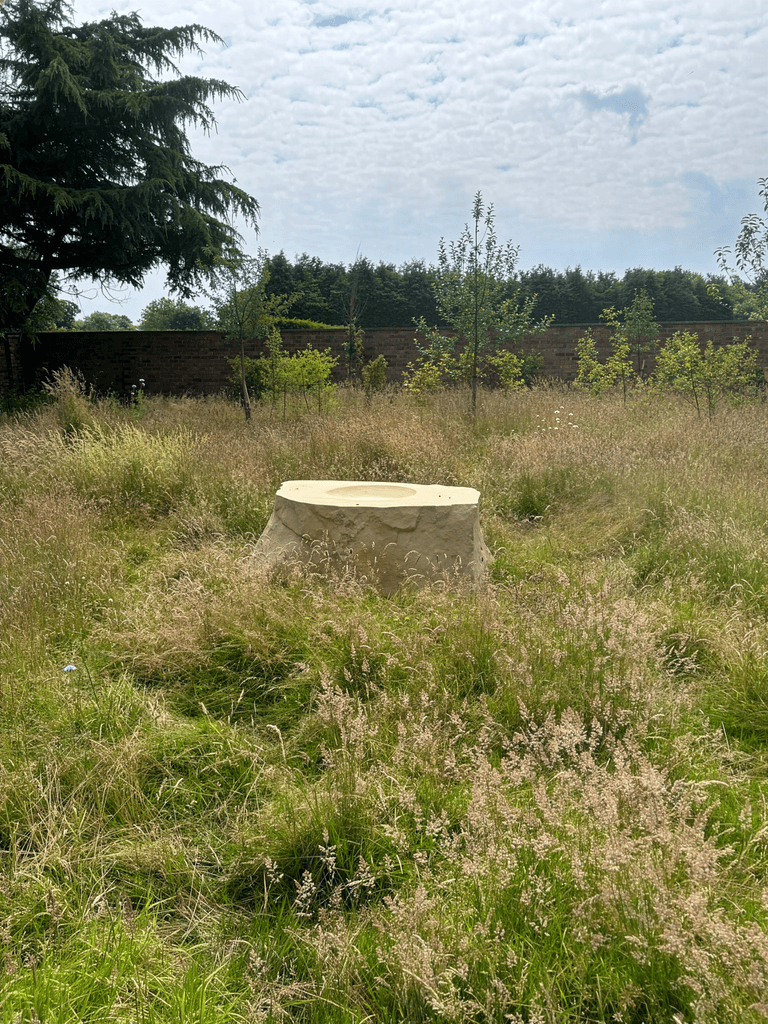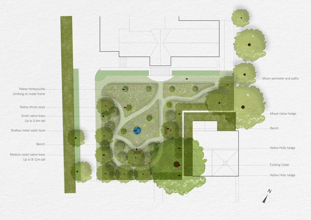 We planted a mix of suitable native trees and shrubs of varying sizes and ages, designed around a path leading from the house and taking in a loop around the space. Masses of wildflowers and bulbs were planted directly into the existing lawn, meadow flowers in the open areas, native ferns and other woodland plants beneath the trees. A bespoke stone bird bath was designed to sit in the centre of the space as yet another reason for wildlife to flock to the garden, which is now alive with the hum of insects on a Summer's day.